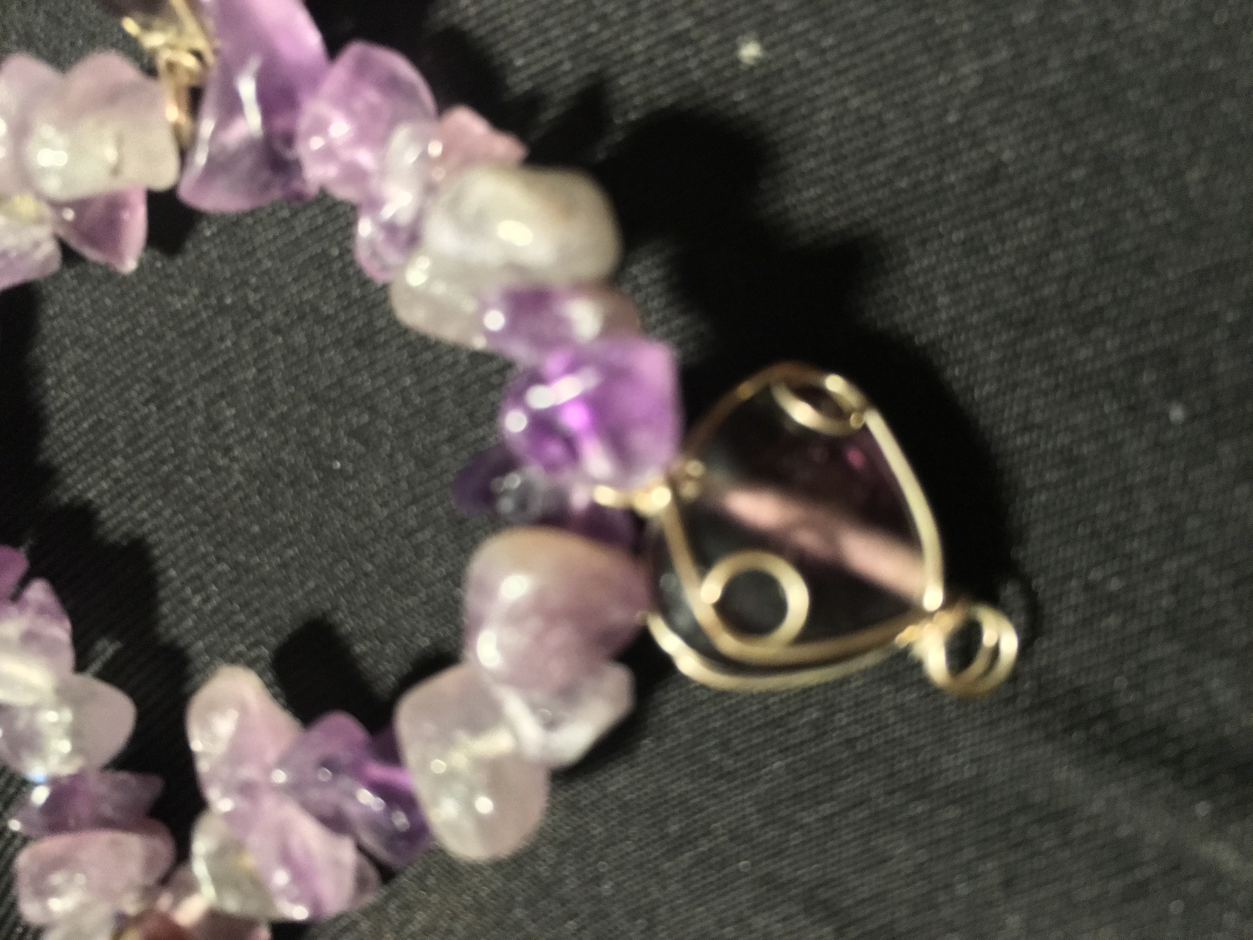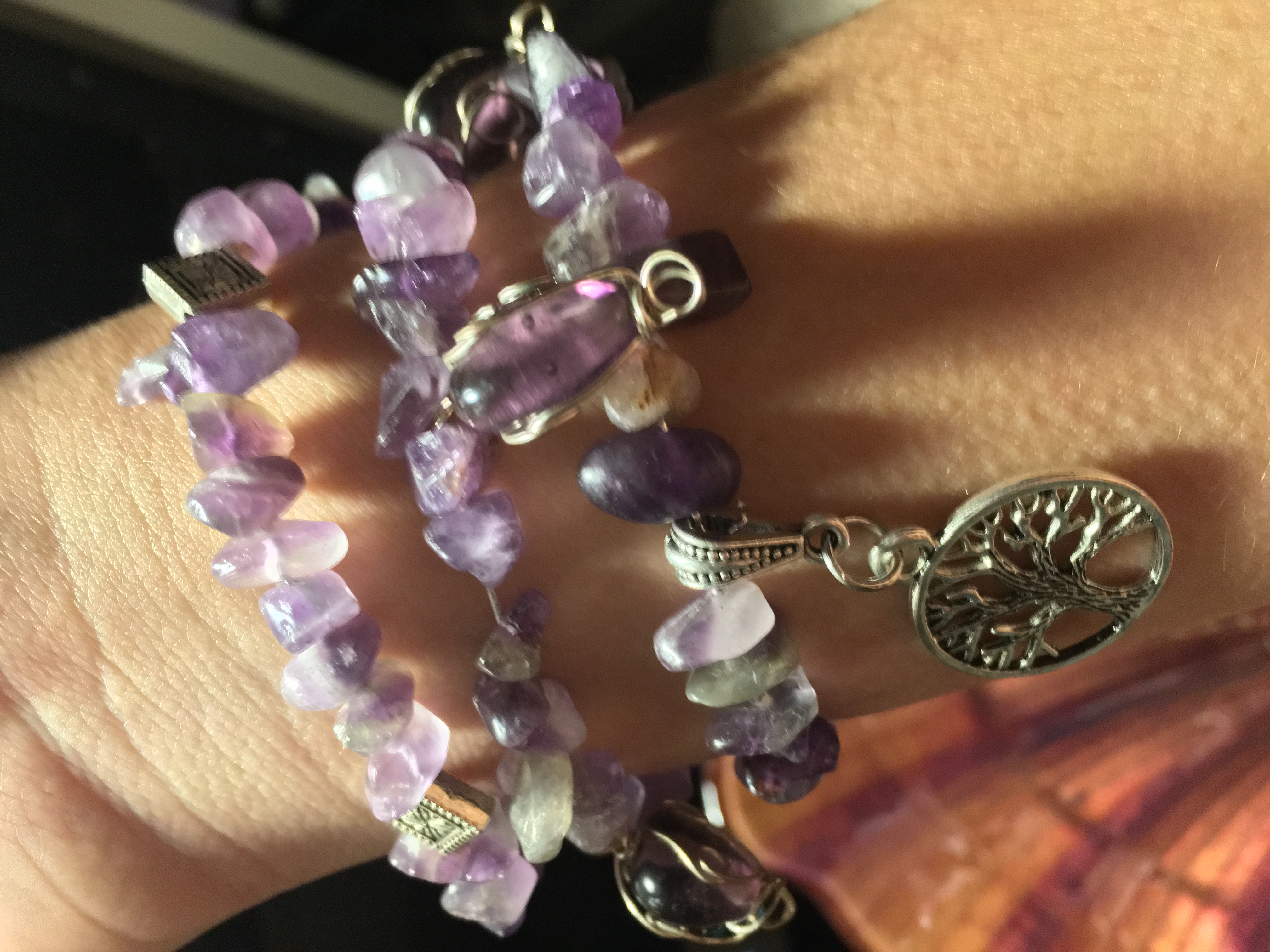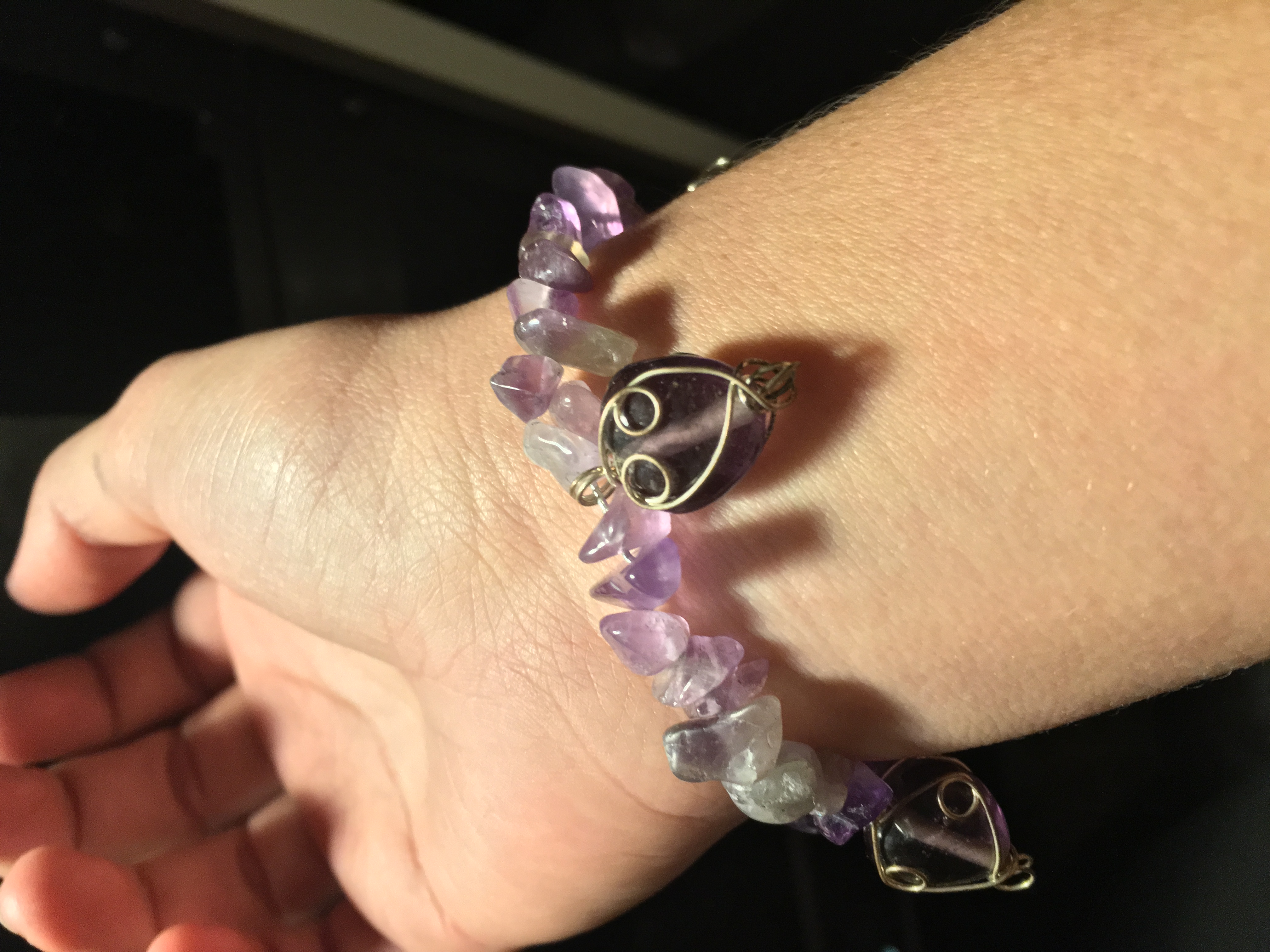 Amethyst chips bracelet on a stretchy elastic band, featuring amethyst wire-wrapped hearts. Amethyst is a truly magical stone known for its connection to the divine. It creates a higher frequency that dissipates negative energy. It has been frequently know for its metaphysical properties, clearing the mind and enhancing meditation.